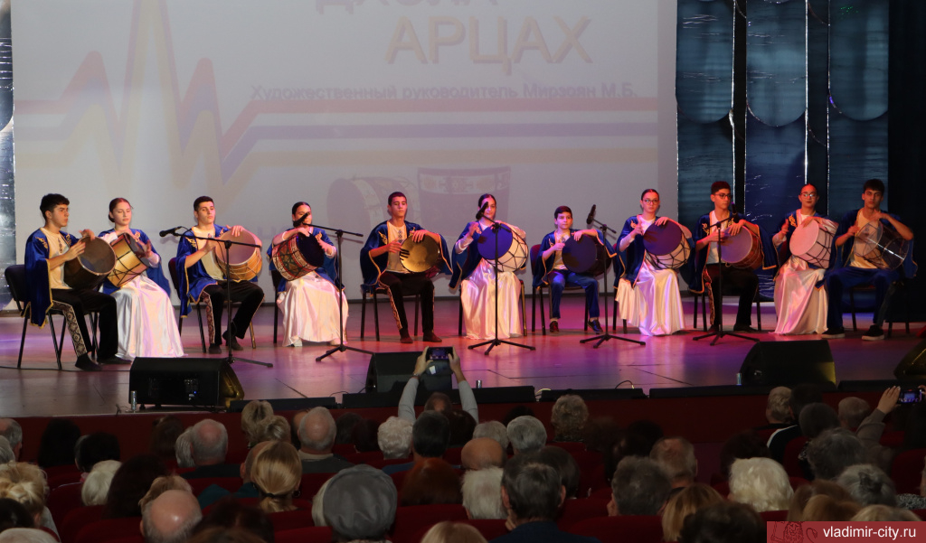Продолжилось мероприятие концертом представителей народных коллективов, проживающих в областной столице. Номера «Ой, ты Россия», «Сказ о граде Владимире», «Ойся ты ойся, ты меня не бойся» исполнили музыкальный театр «Разгуляй», фольклорный ансамбль «Муравушка», муниципальный ансамбль «Вишенка». Башкирский, татарский, кавказский, азербайджанский танцы представил камерный балет «Гестус». Также выступил ансамбль национального армянского танца «Арарат» и ученики школы барабанов «Арцах». Завершилась программа песней «Катюша» на разных языках, исполнили которую народный коллектив «Хор ветеранов Войны, Труда и Вооруженных сил им. Погосова», театр песни «Амега» и представители национальных общественных организаций города Владимира.
