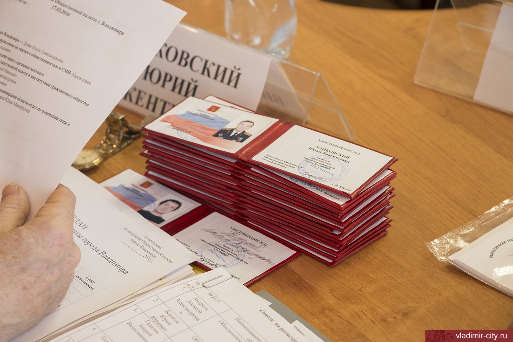 17 марта состоялось второе заседание Общественной палаты города Владимира, на котором глава города Ольга Деева и председатель палаты Юрий Чайковский вручили удостоверения членам палаты и их помощникам.