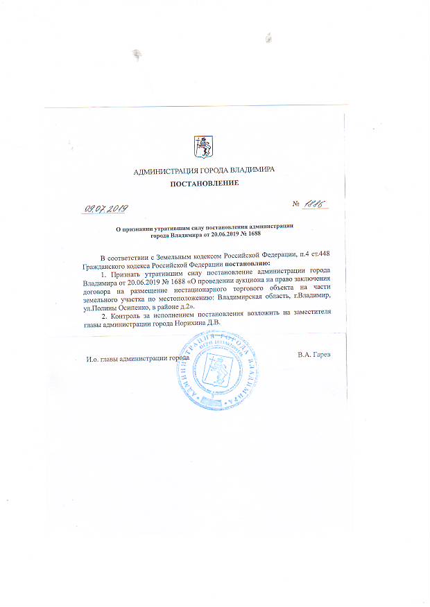 5. Решение органа, уполномоченного на принятие правового акта о проведении аукциона: постановление администрации города Владимира 20.06.2019 № 1688 «О проведении аукциона на право заключения договора на размещение нестационарного торгового объекта на части земельного участка по местоположению: Владимирская область, г.Владимир, ул.Полины Осипенко, в районе д.2».