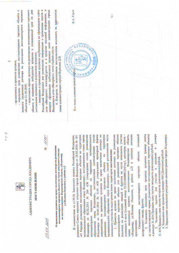 2. Адрес организатора аукциона: 600005, г.Владимир, Октябрьский проспект, д.47, телефон: 53-60-75. Интернет-сайт: www.vladimir-city.ru.