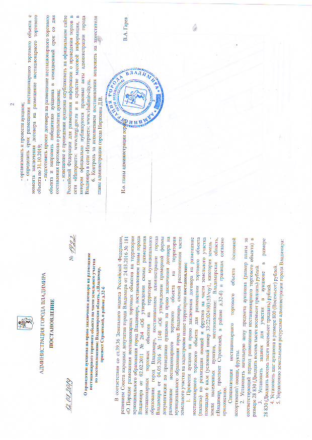 5. Решение органа, уполномоченного на принятие правового акта о проведении аукциона: постановление администрации города Владимира 12.07.2019 № 1922 «О проведении аукциона на право заключения договора на размещение нестационарного торгового объекта на части земельного участка по местоположению: Владимирская область, г.Владимир, проспект Строителей, в районе д.32-б».