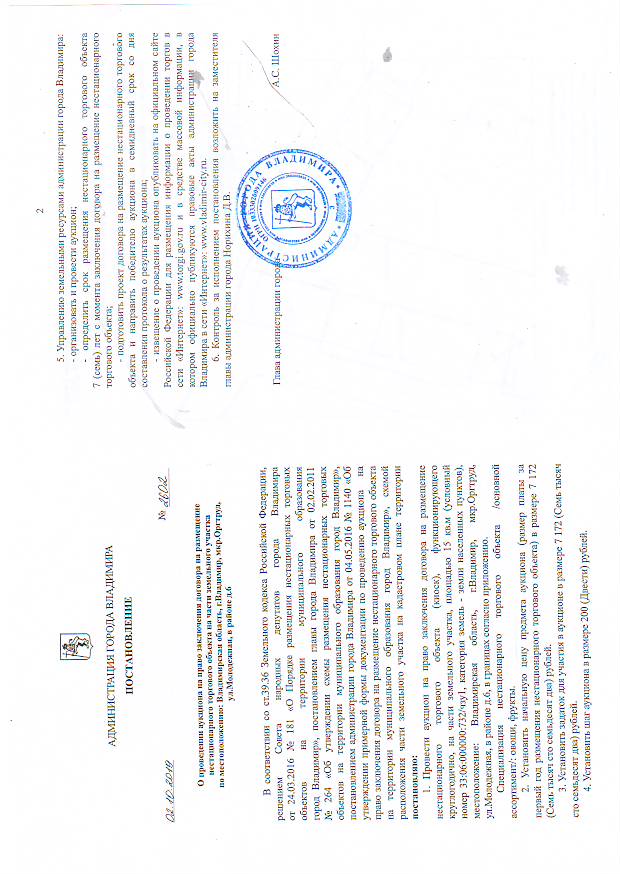 5. Решение органа, уполномоченного на принятие правового акта о проведении аукциона: постановление администрации города Владимира от 02.10.2019 № 2602«О проведении аукциона на право заключения договора на размещение нестационарного торгового объекта на части земельного участка по местоположению: Владимирская область, г.Владимир, мкр.Оргтруд, ул.Молодёжная, в районе д.6».