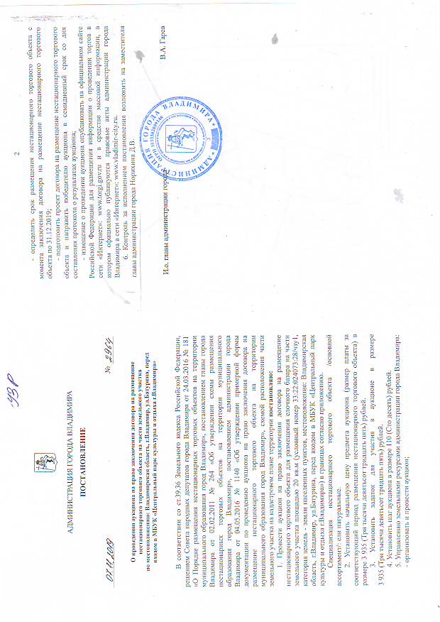 5. Решение органа, уполномоченного на принятие правового акта о проведении аукциона: постановление администрации города Владимира от 07.11.2019 № 2964 «О проведении аукциона на право заключения договора на размещение нестационарного торгового объекта на части земельного участка по местоположению: Владимирская область, г.Владимир, ул. Батурина, перед входом в МБУК «Центральный парк».