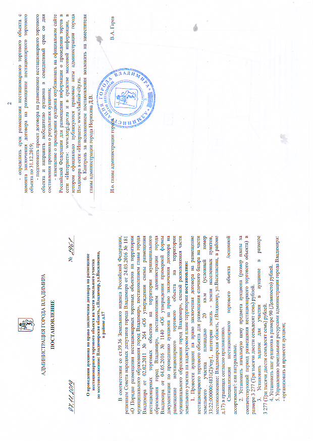 5. Решение органа, уполномоченного на принятие правового акта о проведении аукциона: постановление администрации города Владимира от 07.11.2019 № 2961 «О проведении аукциона на право заключения договора на размещение нестационарного торгового объекта на части земельного участка по местоположению: Владимирская область, г.Владимир, ул.Василисина, в районе д.17».