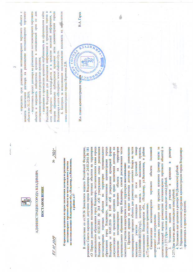 5. Решение органа, уполномоченного на принятие правового акта о проведении аукциона: постановление администрации города Владимира от 07.11.2019 № 2966 «О проведении аукциона на право заключения договора на размещение нестационарного торгового объекта на части земельного участка по местоположению: Владимирская область, г.Владимир, ул.Василисина, в районе д.17».