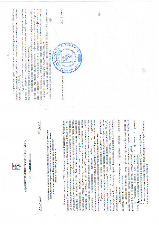 5. Решение органа, уполномоченного на принятие правового акта о проведении аукциона: постановление администрации города Владимира от 21.11.2019 № 3121 «О проведении аукциона на право заключения договора на размещение нестационарного торгового объекта на части земельного участка по местоположению: Владимирская область, г.Владимир, просп.Строителей, в районе д.25».