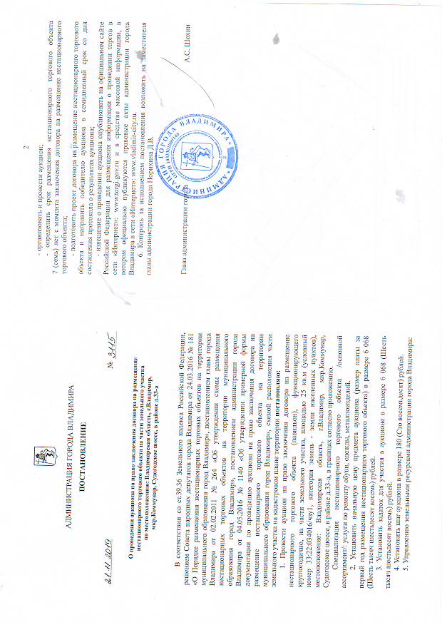 5. Решение органа, уполномоченного на принятие правового акта о проведении аукциона: постановление администрации города Владимира от 21.11.2019 №3115«О проведении аукциона на право заключения договора на размещение нестационарного торгового объекта на части земельного участка по местоположению: Владимирская область, г.Владимир, мкр.Коммунар, Судогодское шоссе, в районе д.33-а».