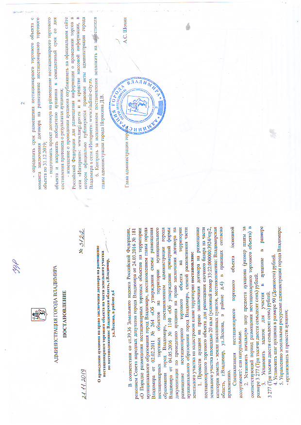 5. Решение органа, уполномоченного на принятие правового акта о проведении аукциона: постановление администрации города Владимира от 21.11.2019 № 3122 «О проведении аукциона на право заключения договора на размещение нестационарного торгового объекта на части земельного участка по местоположению: Владимирская область, г.Владимир, ул.Лескова, в районе д.4».