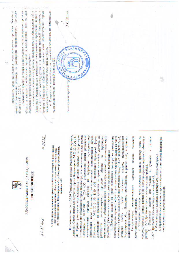 5. Решение органа, уполномоченного на принятие правового акта о проведении аукциона: постановление администрации города Владимира от 21.11.2019г. № 3126 «О проведении аукциона на право заключения договора на размещение нестационарного торгового объекта на части земельного участка по местоположению: Владимирская область, г.Владимир, просп.Ленина, в районе д.43».