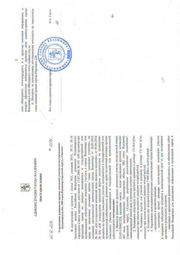 2. Решение органа, уполномоченного на принятие правового акта о проведении аукциона: постановление администрации города Владимира от 25.12.2019 № 3541 «О проведении аукциона по продаже земельного участка по местоположению: Владимирская обл., МО город Владимир (городской округ), с.Спасское».