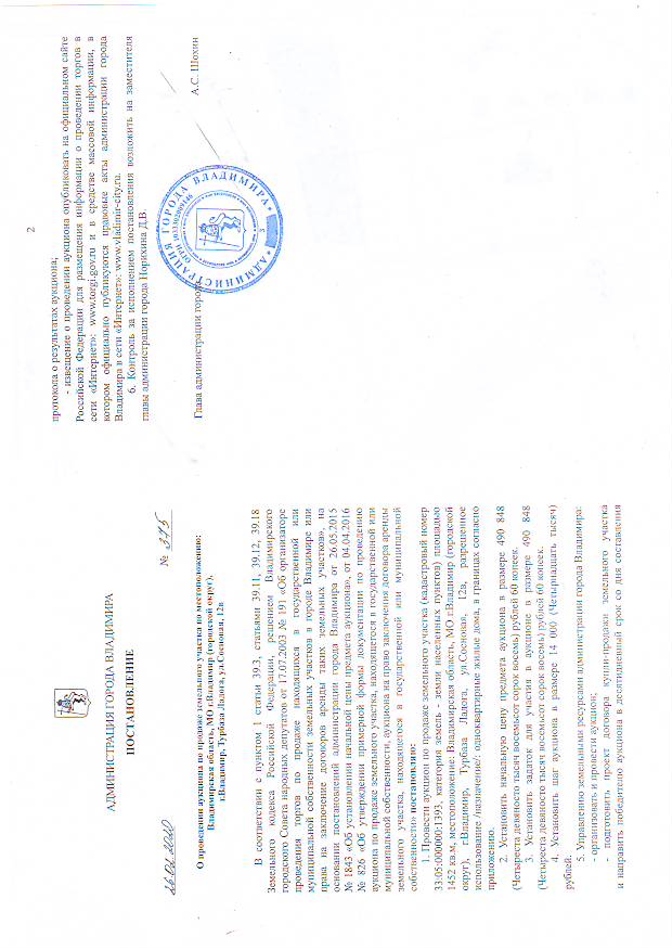 2. Решение органа, уполномоченного на принятие правового акта о проведении аукциона: постановление администрации города Владимира от 26.02.2020 № 375 «О проведении аукциона по продаже земельного участка по местоположению: Владимирская обл., МО город Владимир (городской округ), г.Владимир, Турбаза Ладога, ул.Сосновая, 12в».